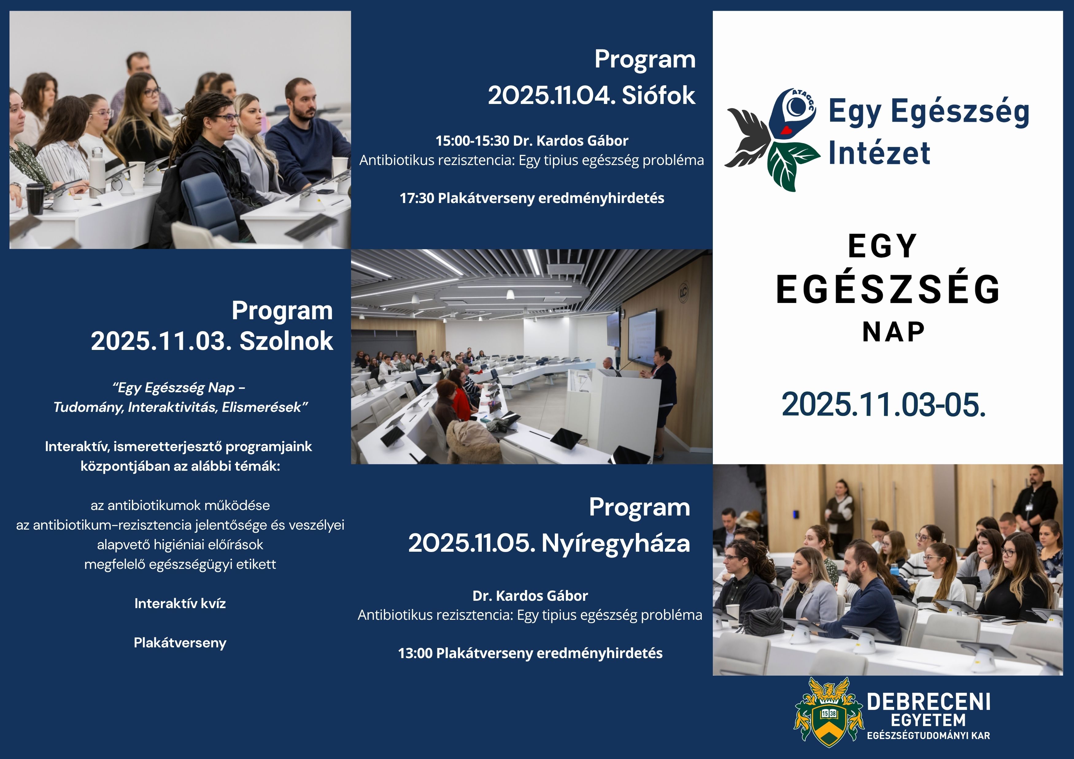 Szakmai szmpóziumot rendez a Debreceni Egyetem Egészségtudományi Kar Egy Egészség Intézete azzal a céllal, hogy közelebb hozza az intézmény hallgatóihoz az Egy Egészség koncepció szemléletét és annak gyakorlati jelentőségét. Ennek lényege, hogy az emberi egészség nem választható el az állatok és a környezet állapotától, hanem a kórokozók terjedése és evolúciója, illetve az élettelen károsító tényezők szempontjából egy rendszert alkotnak.